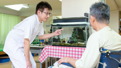 当院は若木原公園に隣接しているので、療養室の窓を開けると、虫の音が聞こえたり季節の風を感じたりすることができます。ベッド上にいながらにして自然を感じられる環境は、まるで懐かしい自宅の縁側にいるようだと好評です。さまざまな事情で在宅介護が困難な方や、長期療養が必要な方にとって、介護医療院は自宅に代わる暮らしの場となります。他の介護保険施設である特別養護老人ホームや介護老人保健施設との違いは、より医学的ケアの必要性が高い方が対象であるという点です。入所されている方の状態によっては、ターミナルケアや看取りへの対応も可能なので、医師や医療従事者がいる場所で最期まで安心して暮らしていただけると思います。